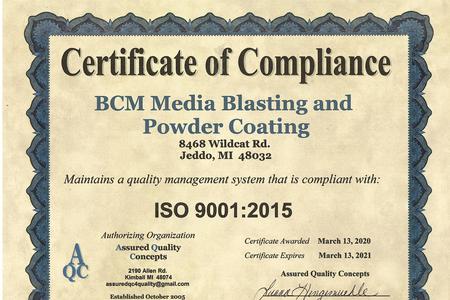 BCM operates a ISO 9001:2015 compliant management system used for all processes throughout the company. BCM performs extensive cross training throughout all their employees giving BCM a big advantage compared to other coating shops.